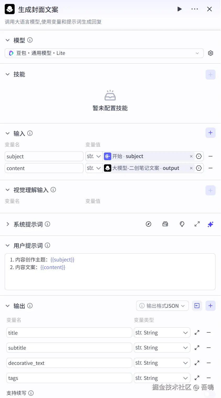 4、封面图文章生成:使用大模型根据新的笔记文案内容,生成一些关键的文案信息,用于封面图文案内容。
