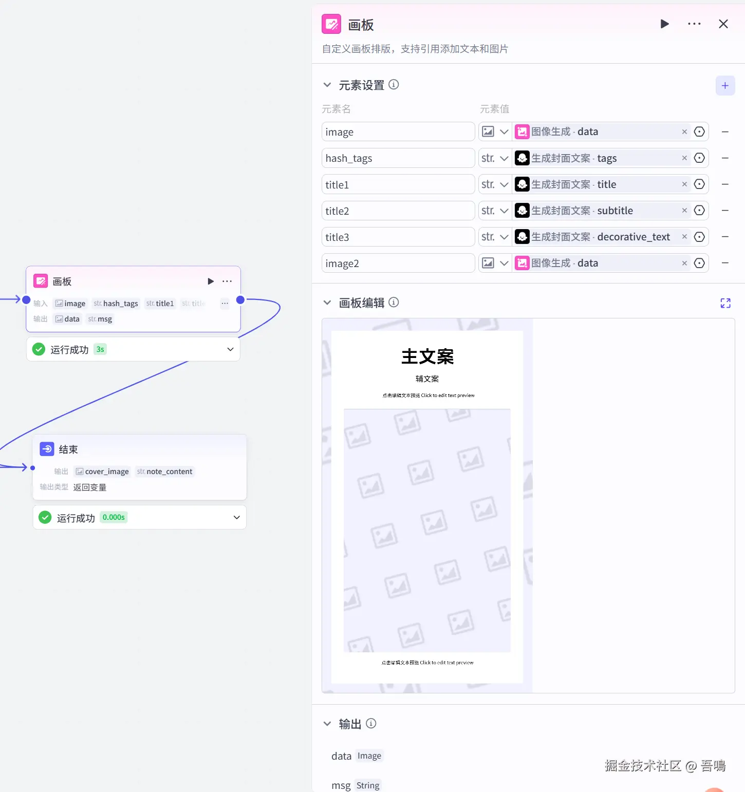 使用了扣子官方的【画板】节点,用于绘制笔记的封面图。