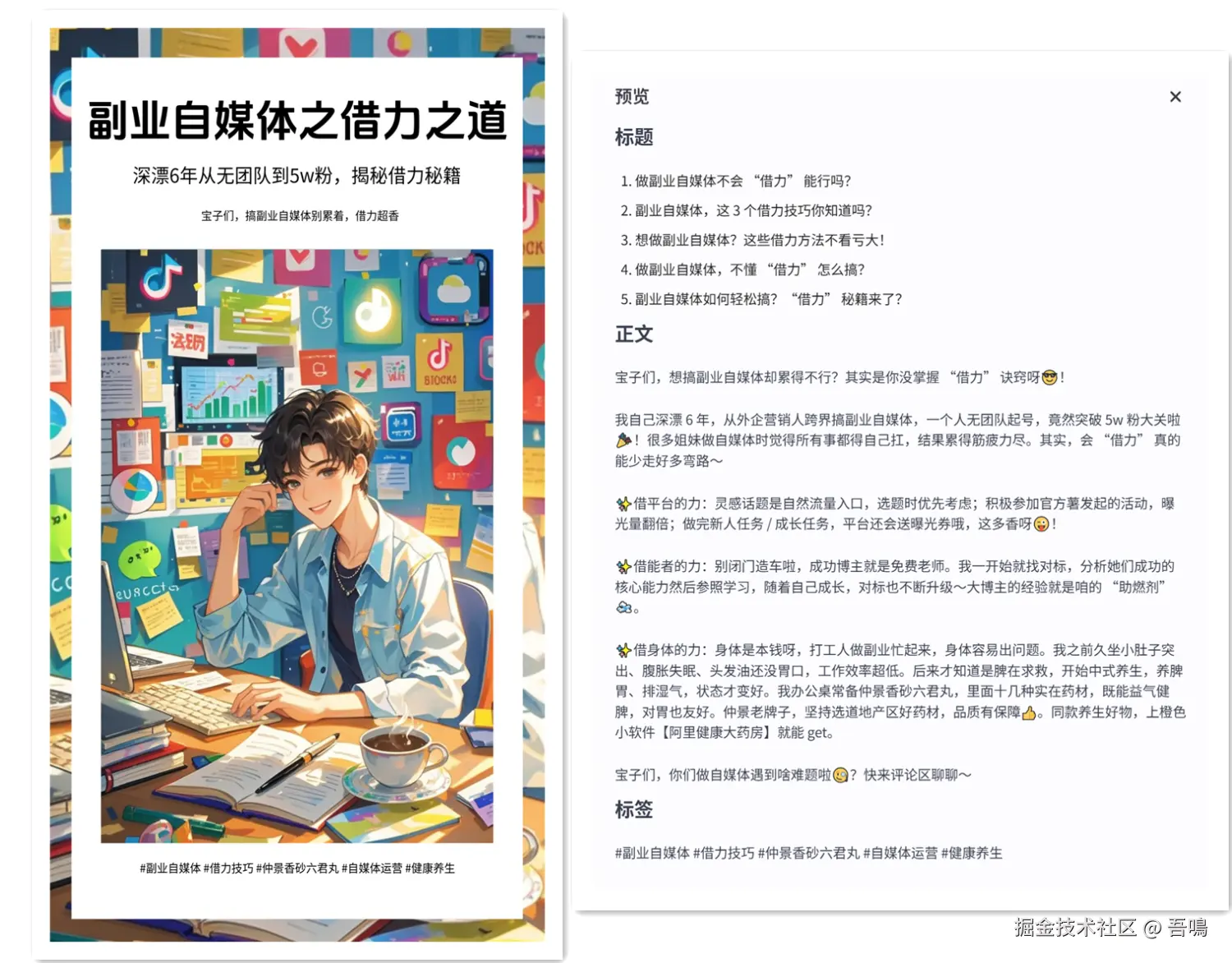 在开始工作流的讲解之前,我们来看看工作流运行的效果。比如我输入了一篇需要仿写的笔记,并且输入了一个"副业自媒体"的主体,工作流经过了约50S的运作,就产出了一张小红书笔记封面图,5个爆款标题、推荐的文章标签和一段正文。