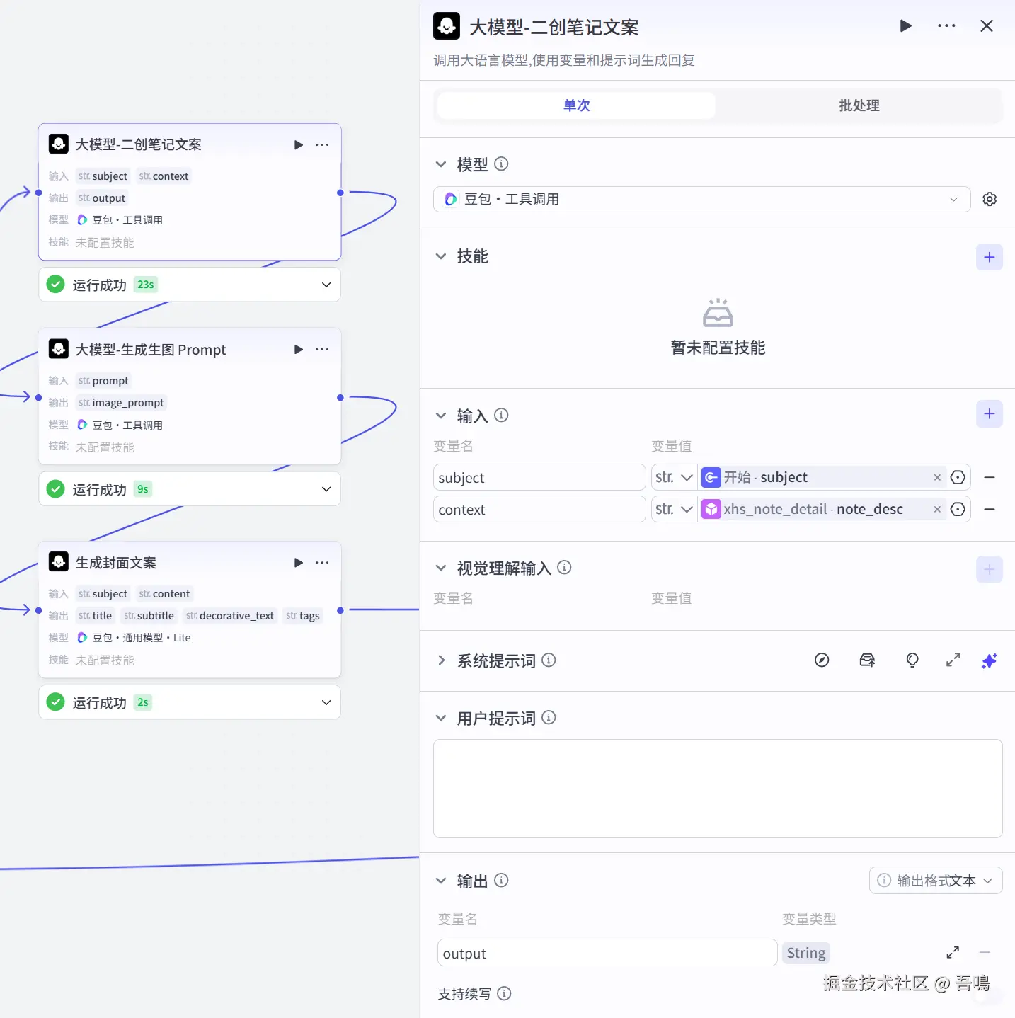 2、二创笔记文案:使用大模型,根据提供的笔记主体、仿写的笔记内容等信息,让大模型参考笔记内容输出新的笔记文案。
