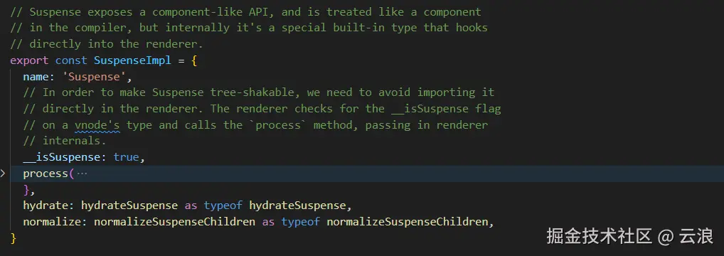 为了使 Suspense 组件支持摇树优化(tree shaking),需要避免直接在渲染器中导入 Suspense 组件。渲染器会检查虚拟节点(vnode)的类型(type)上是否有 __isSuspense