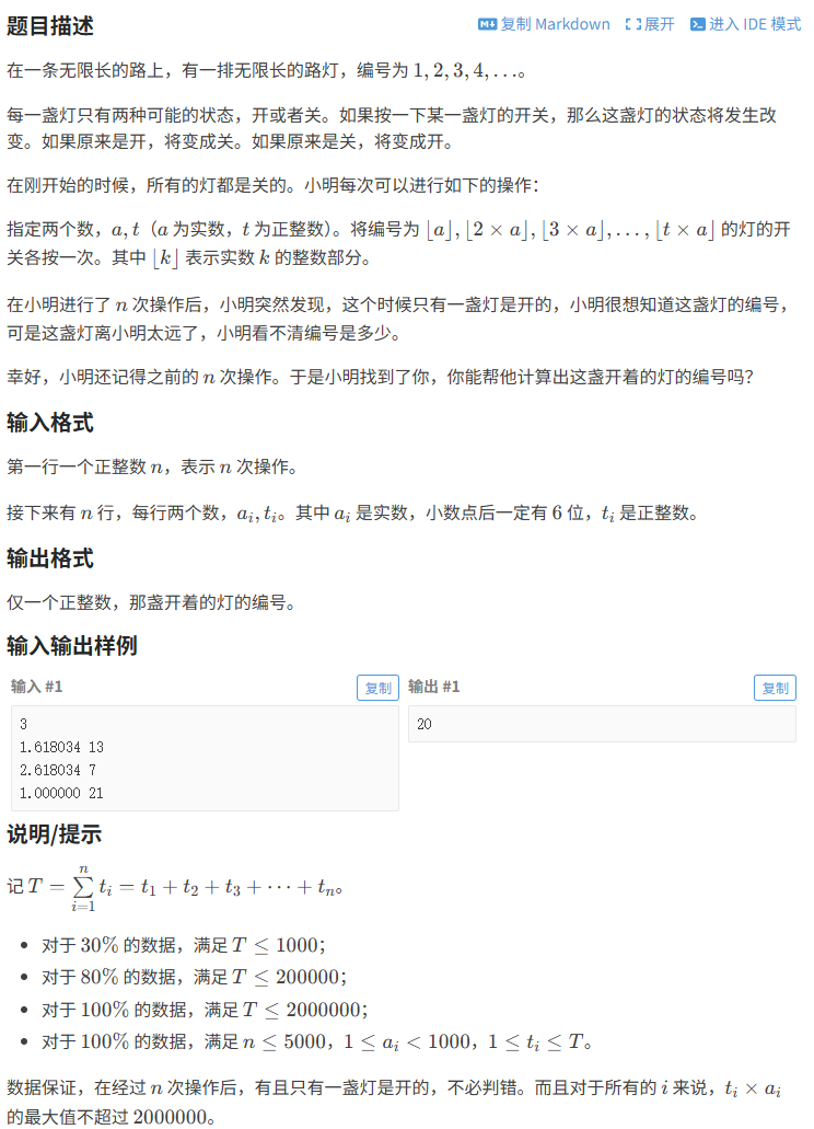 给定n次操作,每次操作指定实数a和正整数t,对编号为⌊a⌋, ⌊2a⌋, ..., ⌊ta⌋的灯进行开关切换。初始所有灯都是关闭的,经过n次操作后,只有一盏灯是亮的,需要找出这盏灯的编号。