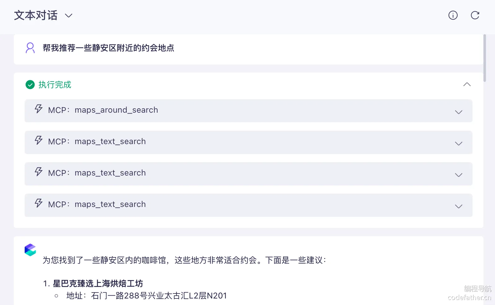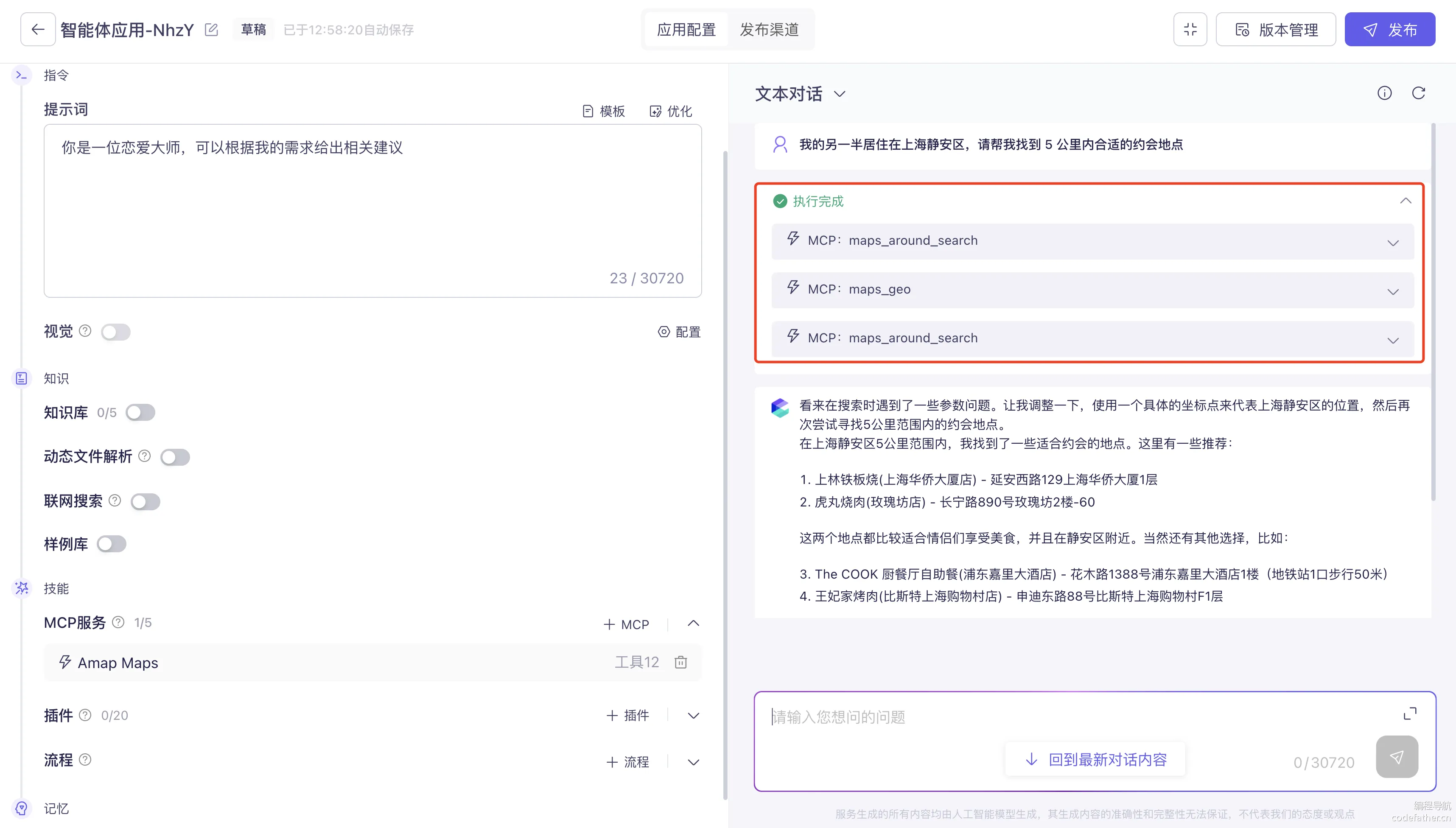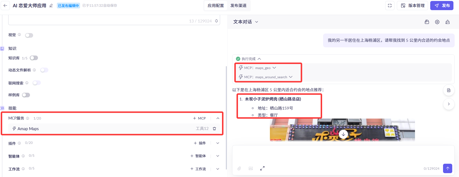 目前我们的 AI 恋爱大师已经具备了恋爱知识问答以及调用工具的能力,现在让我们再加一个实用功能:根据另一半的位置找到合适的约会地点。