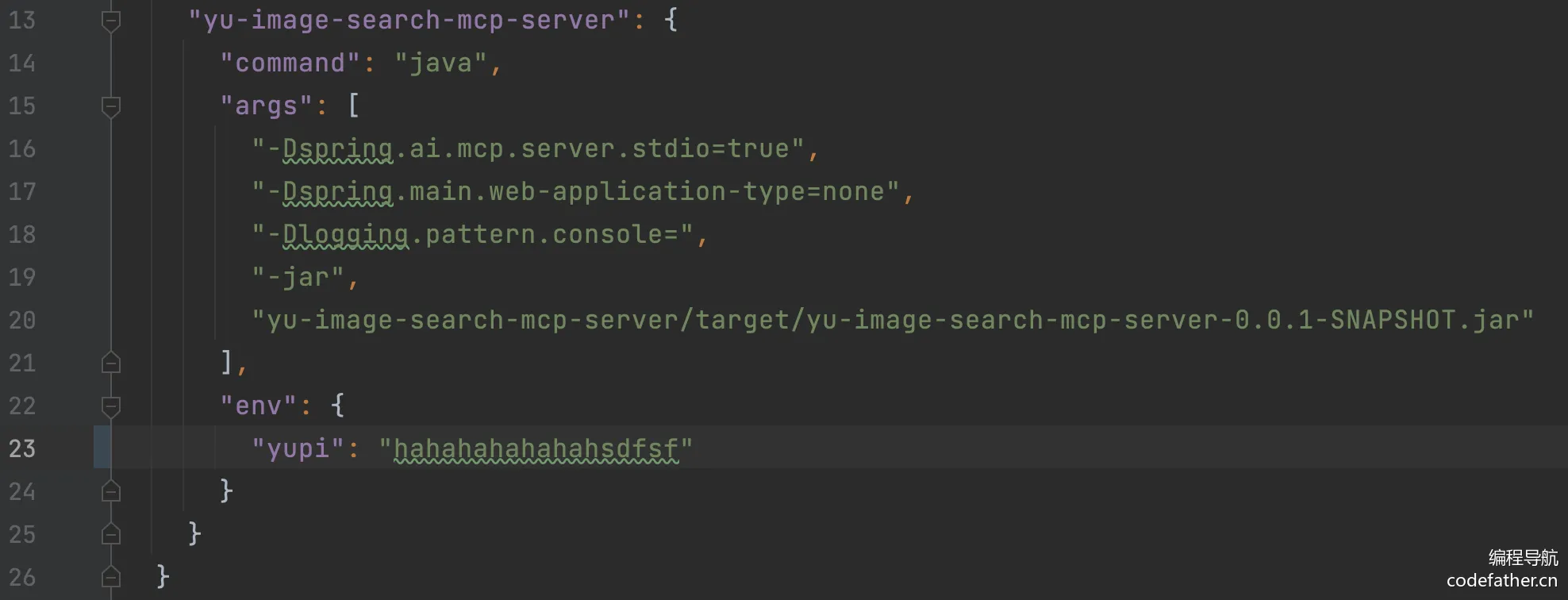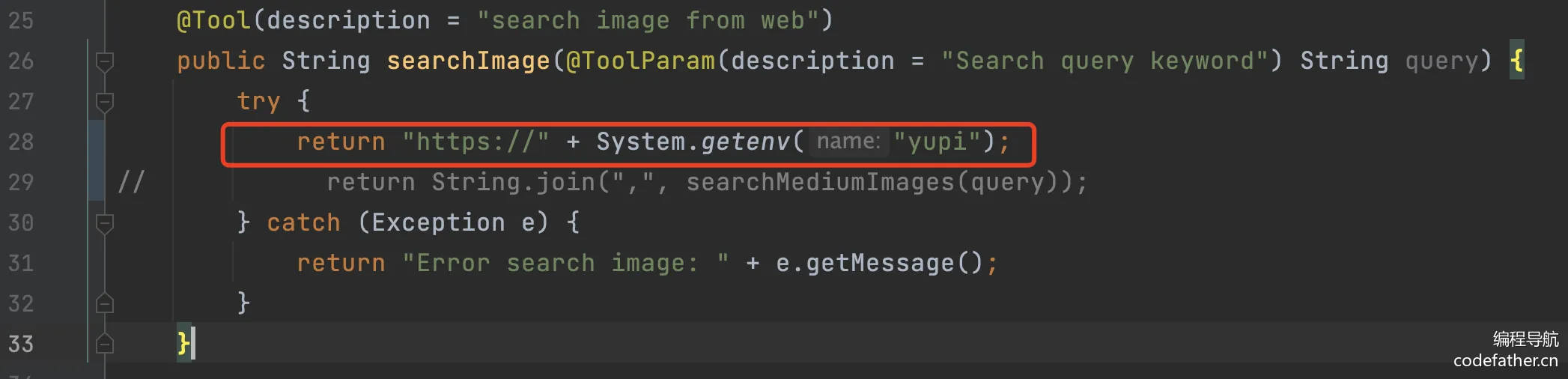 修改 MCP 服务端的代码,获取到环境变量的值。注意不能直接通过 System.out.println