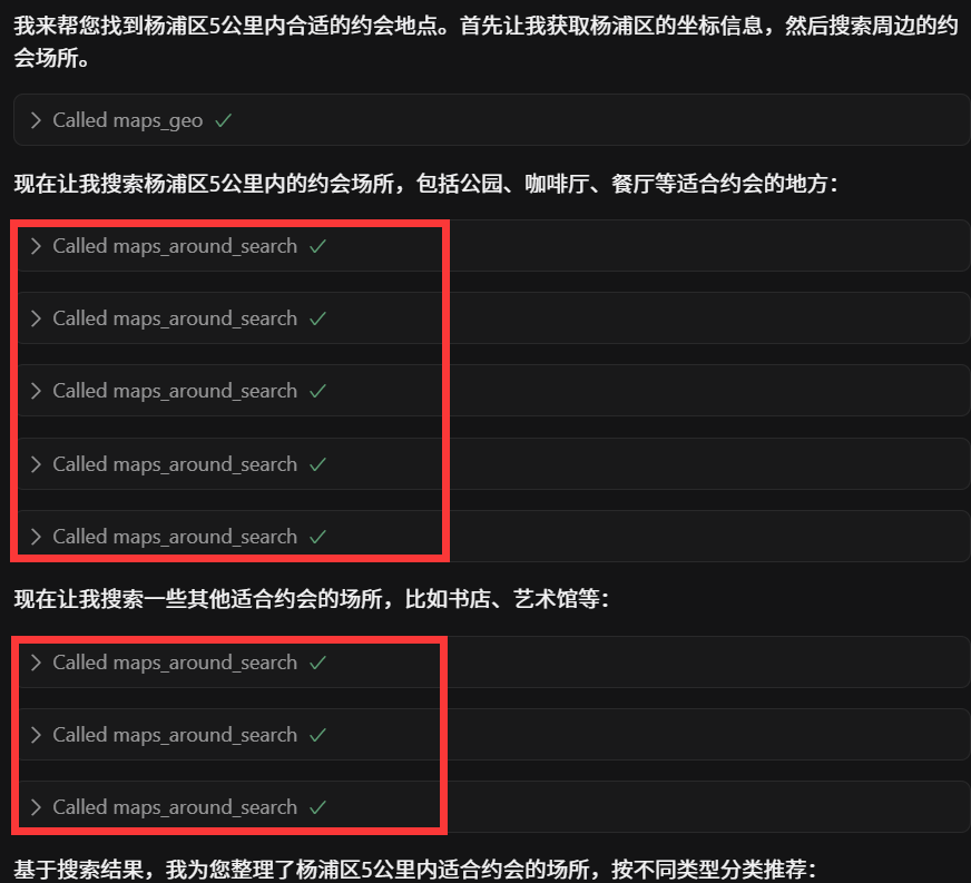 - 直接利用 AI 大模型自身的能力:大模型本身就有一定的训练知识,可以识别出知名的位置信息和约会地点,但是不够准确。