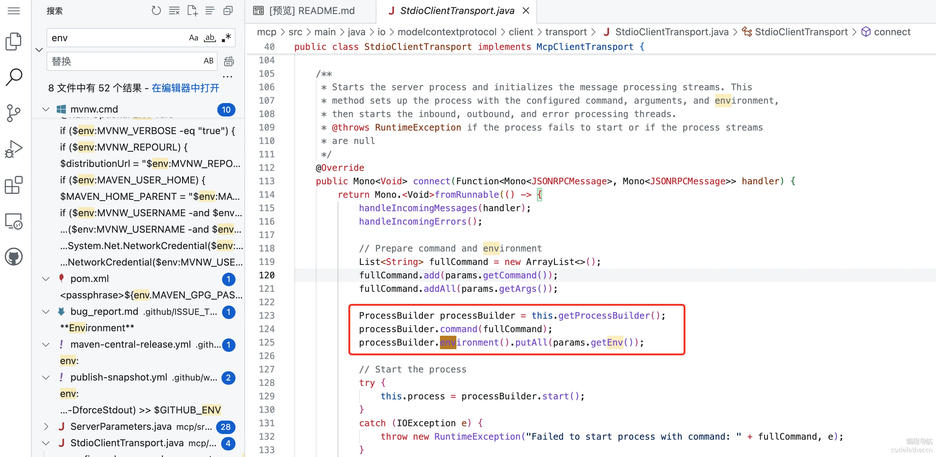 让我们来看下 Java MCP Client 的源码,发现建立连接时客户端传递的环境变量会被设置到服务器进程的环境变量中(可能存在一定的安全风险):