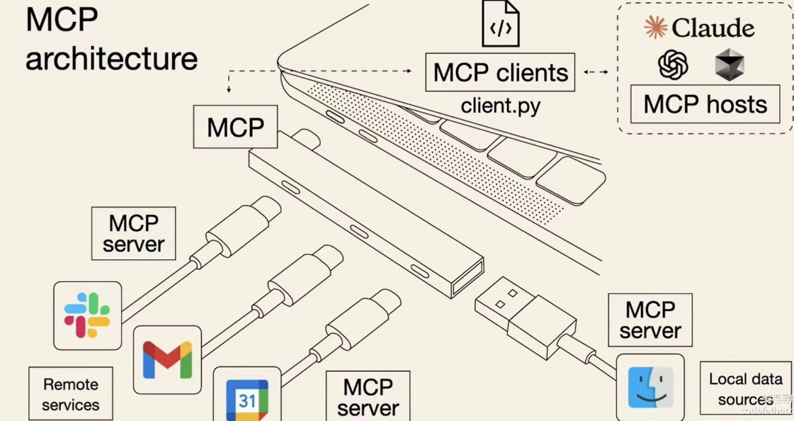 。可以将 MCP 想象成 AI 应用的 USB 接口。就像 USB 为设备连接各种外设和配件提供了标准化方式一样,MCP 为 AI 模型连接不同的数据源和工具提供了标准化的方法。