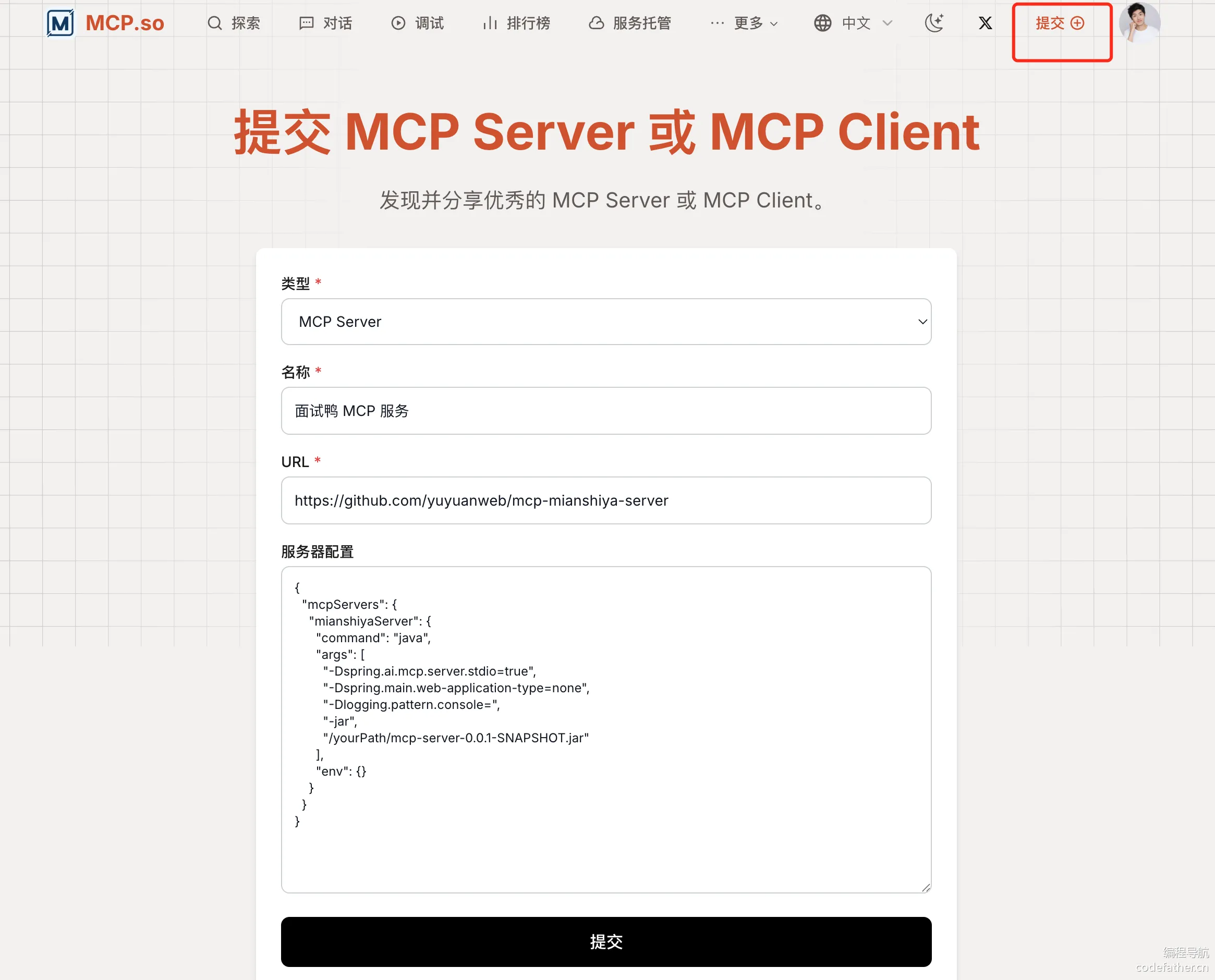 4)在任何一个 MCP 服务市场上提交自己开源的 MCP 服务,注意不要暴露敏感信息