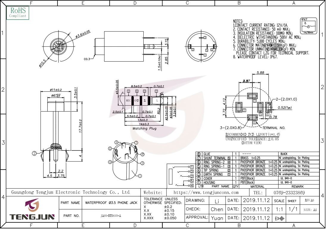 在户外装备、工业通讯、医疗设备等场景中,音频接口既要抵御水汽、油污等恶劣环境侵蚀,又要保障高频插拔下的稳定传输,传统耳机插座常因防护不足、结构松散陷入"失效困境"。TENGJUN推出的JA05-BPD035-A防水耳机插座,以IPX7级防水为核心,融合4极配置、内置开关、高耐久性等多重特性,精准破解复杂场景下的音频连接难题,成为跨领域接口解决方案的优选。