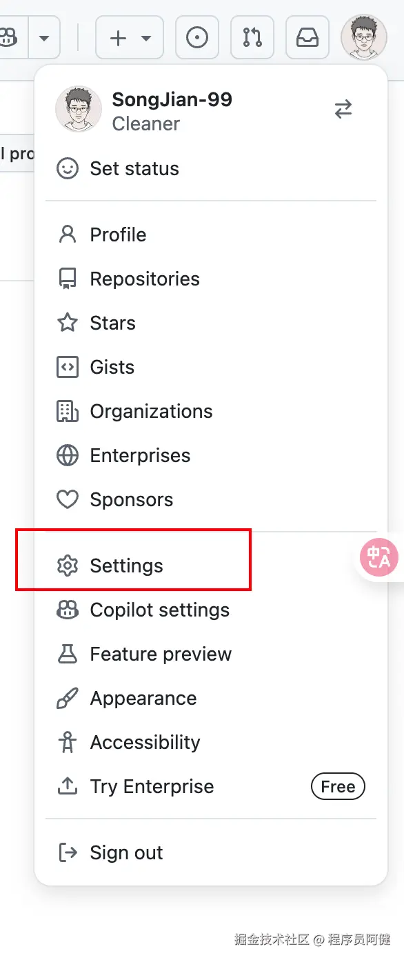- 打开 GitHub,点击头像 -> settings ,进入到 GItHub Settings 页面。