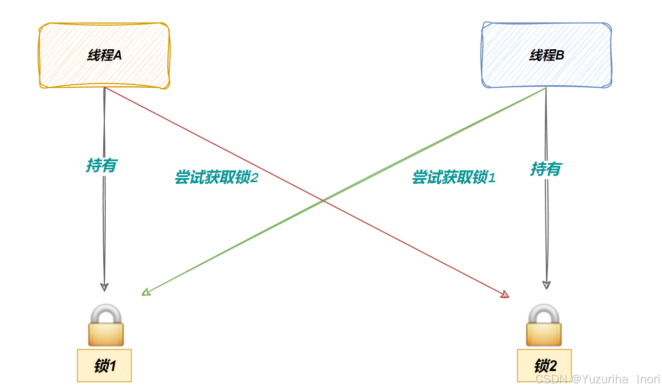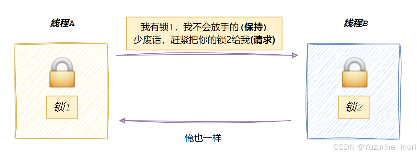 线程A申请线程B时,B一直不释放,A将会一直进行等待。同样的线程B申请线程A,A一直不释放,B也会一直进行等待。于是线程AB都陷入了一直的等待中。