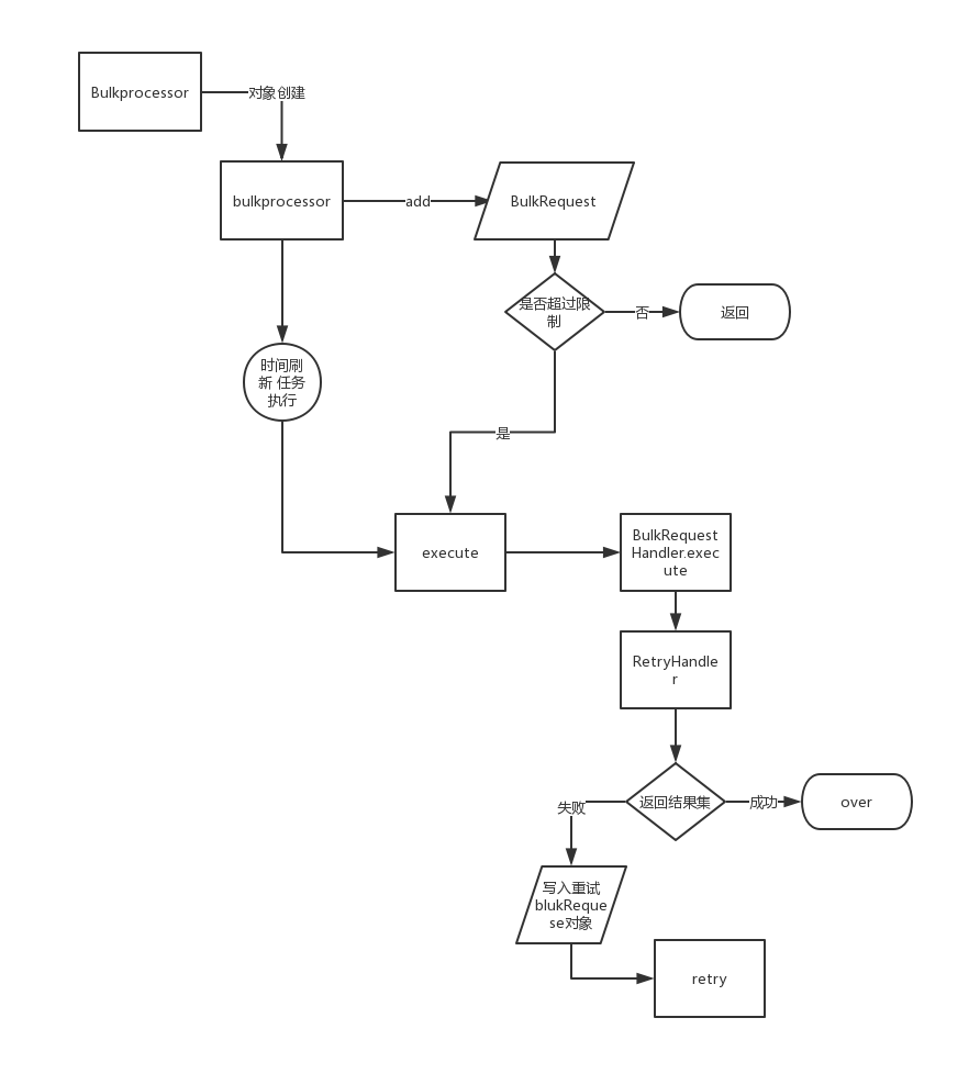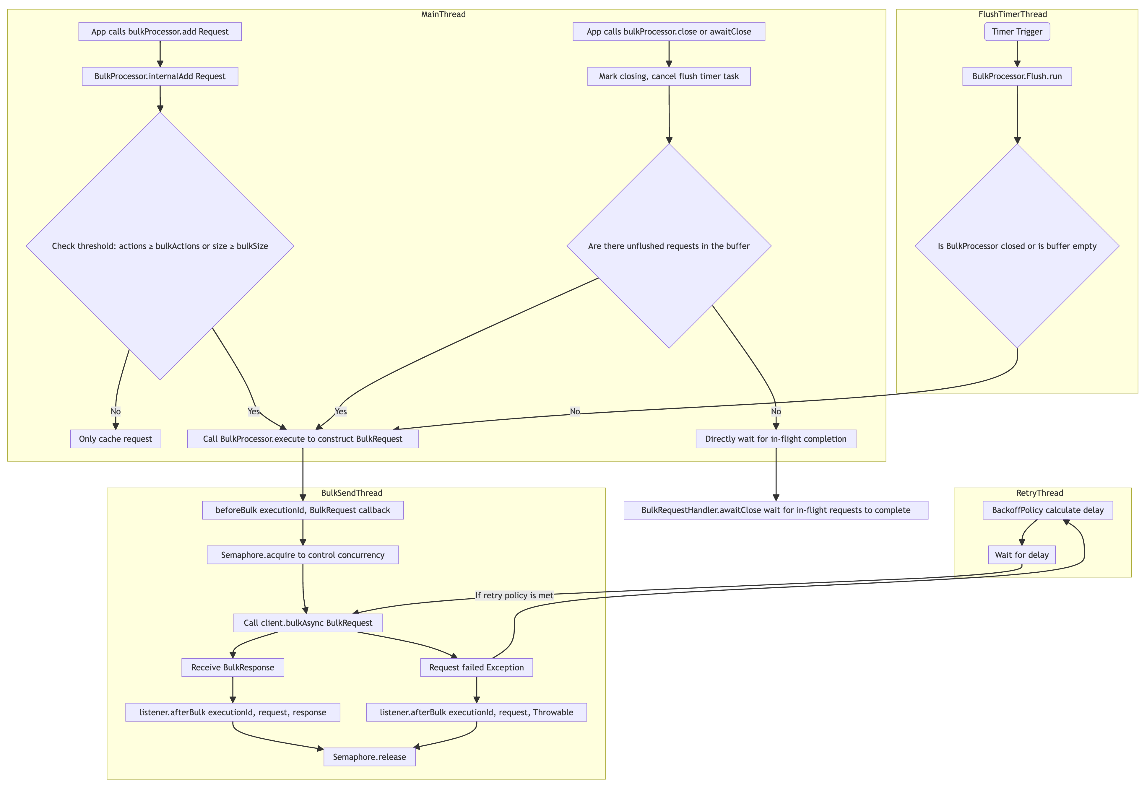 - 消费者:BulkProcessor 内部管理的线程池,负责收集操作、批量执行、处理响应。