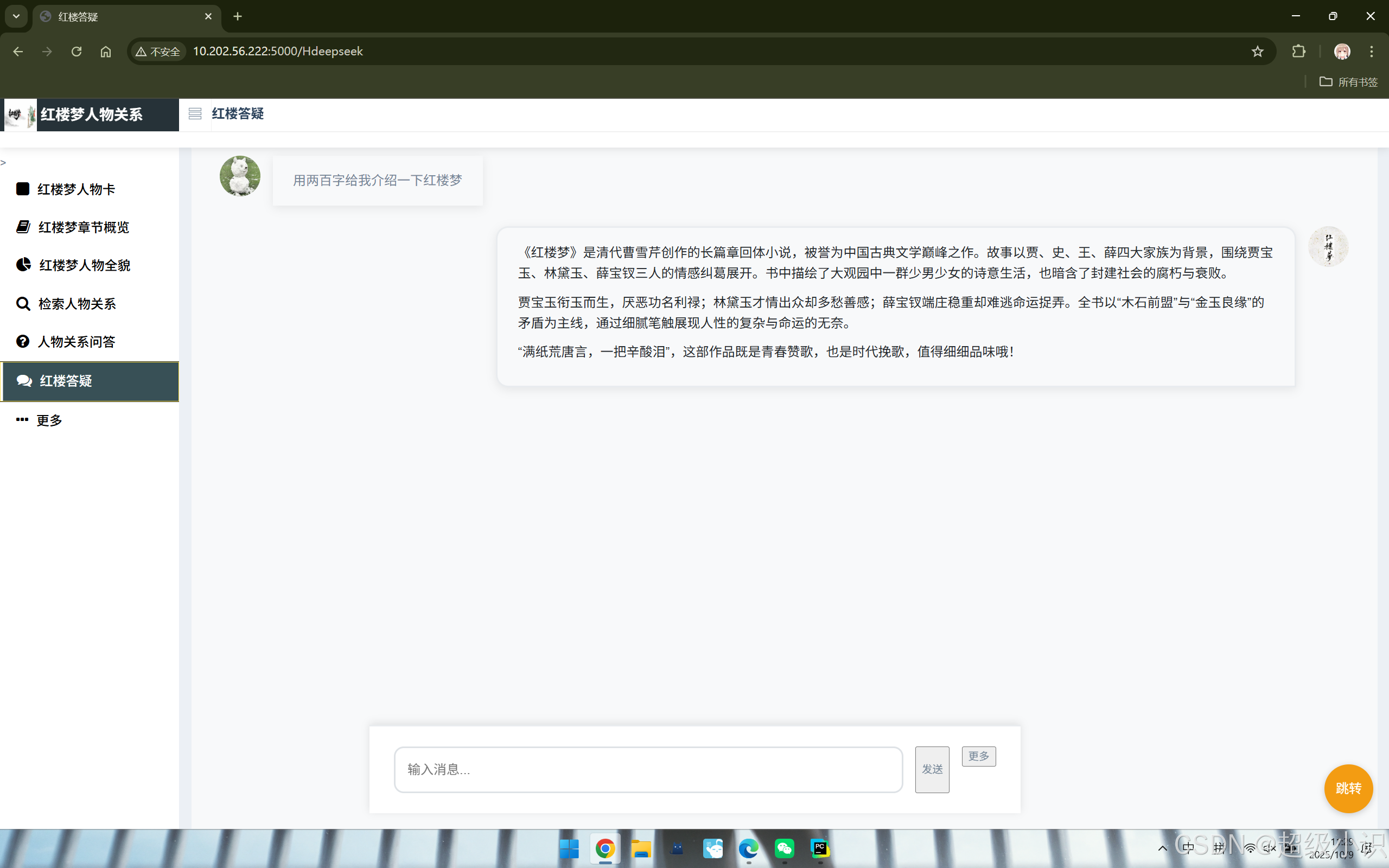 用户可以进入图谱DIY模块,输入目标著作名,可点击网络生成或本地生成,即可直接生成新的著作模块。该模块中包含了人物关系全貌,检索人物关系,人物关系问答板块,提供全套的著作学习帮助。用户可直接在该模块查看全局人物关系节点图,查找指定人物关系,在问答系统中询问人物关系,进行个性化的学习。