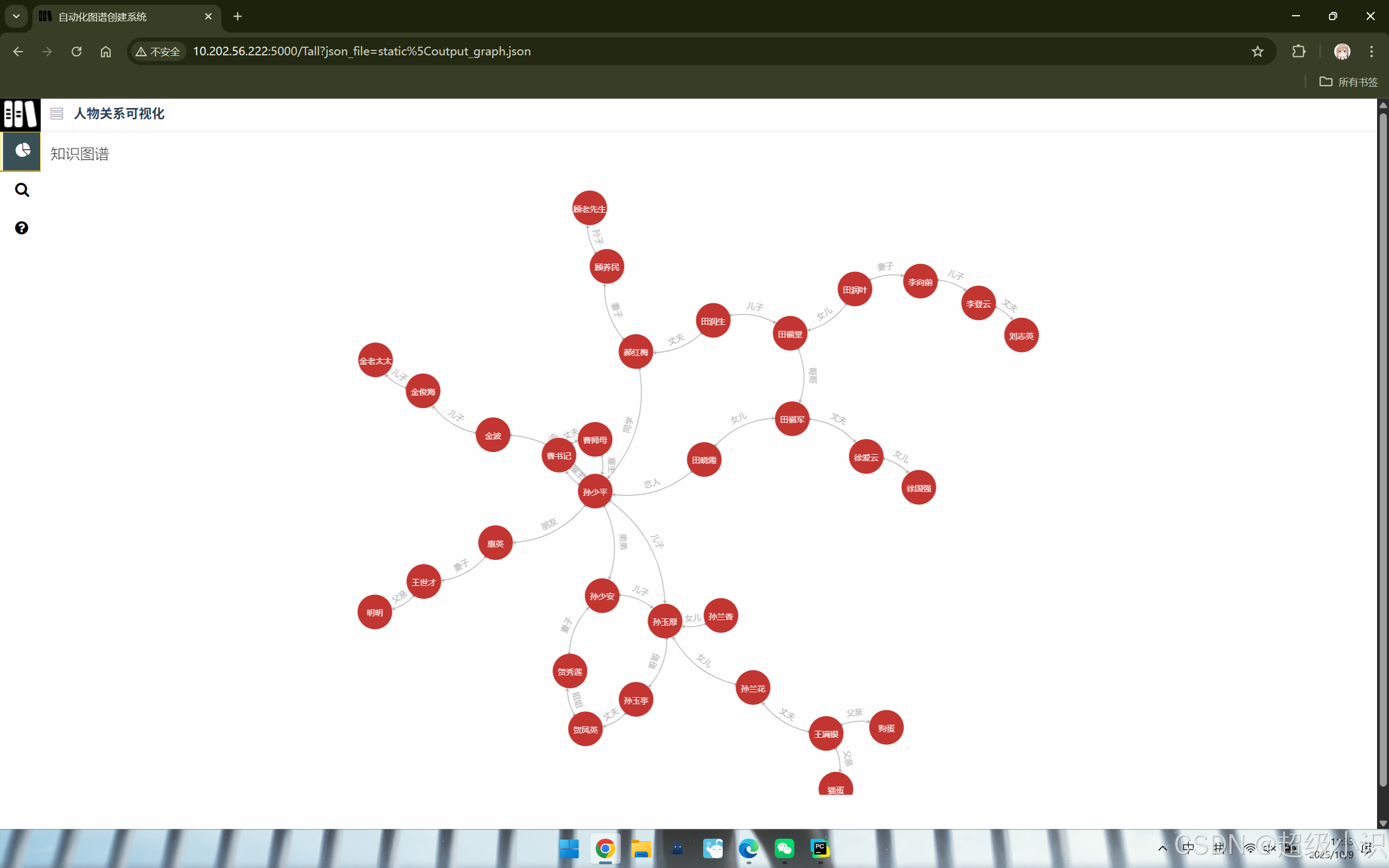 图谱自动化生成框架部分拥有本地生成,网络生成,以及文本解析功能,选择三者其一后可以得到自动化生成的人物关系全貌查询,人物精确检索,链式问题问答三个功能
