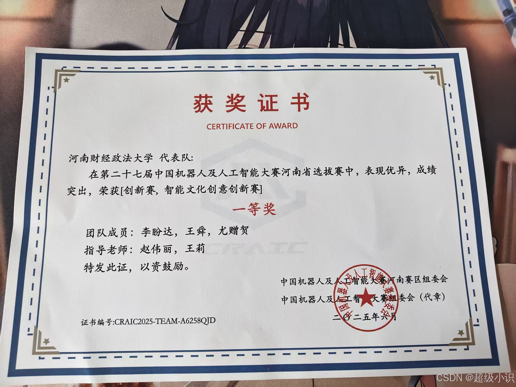 分别为中国机器人及人工智能大赛河南省省赛一等奖,软件架构引入证明,中国机器人及人工智能大赛全国总决赛一等奖,软件著作权