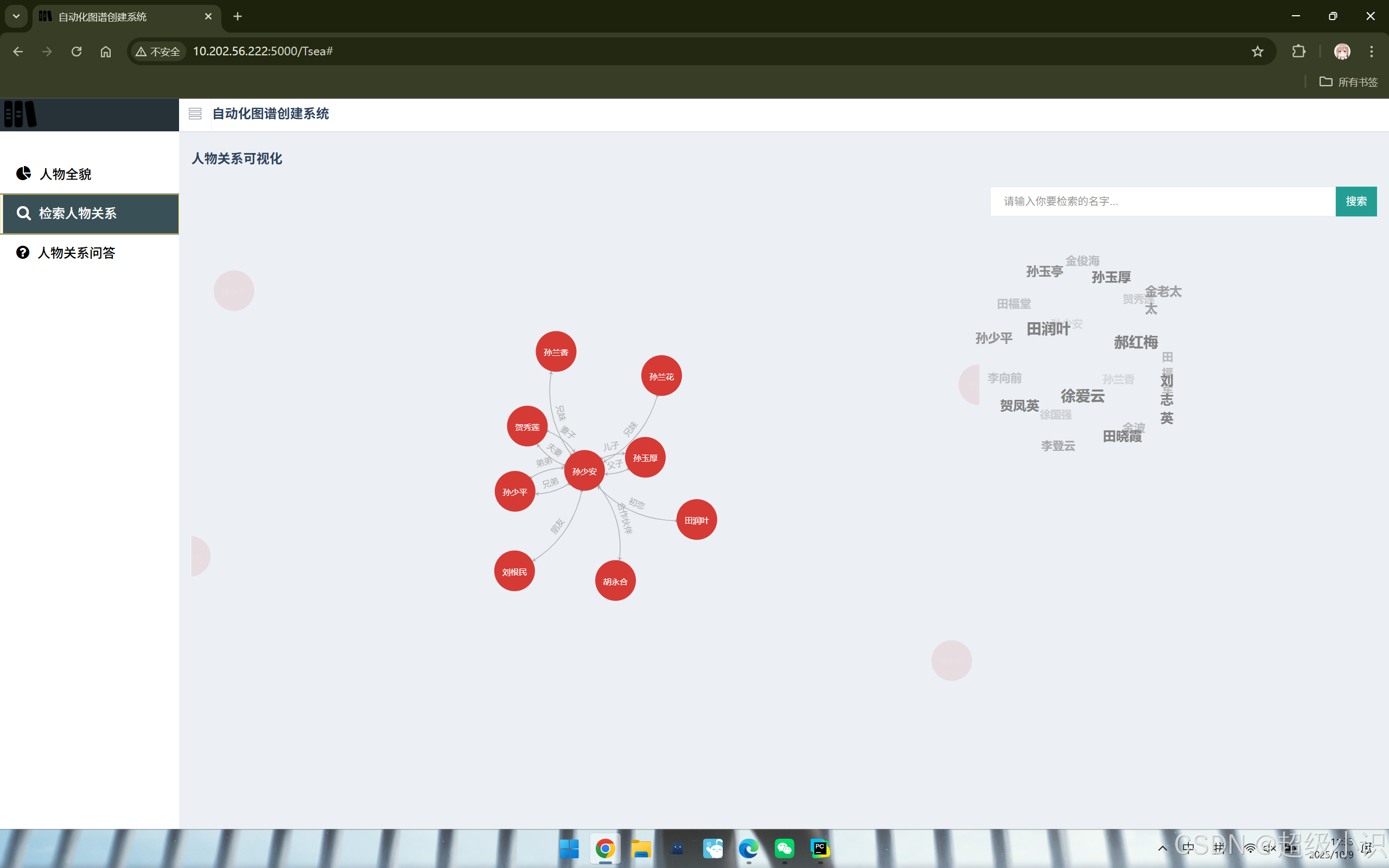 用户可以通过每个模块的人物全貌板块,人物全貌板块会显示全局人物关系网络,帮助用户纵观所有人物关系。在人物检索界面,用户可以输入目标人物后,即可输出个人关系节点图。人物关系问答界面,人物问答系统通过文本语言识别,针对性输出人物关系节点图。