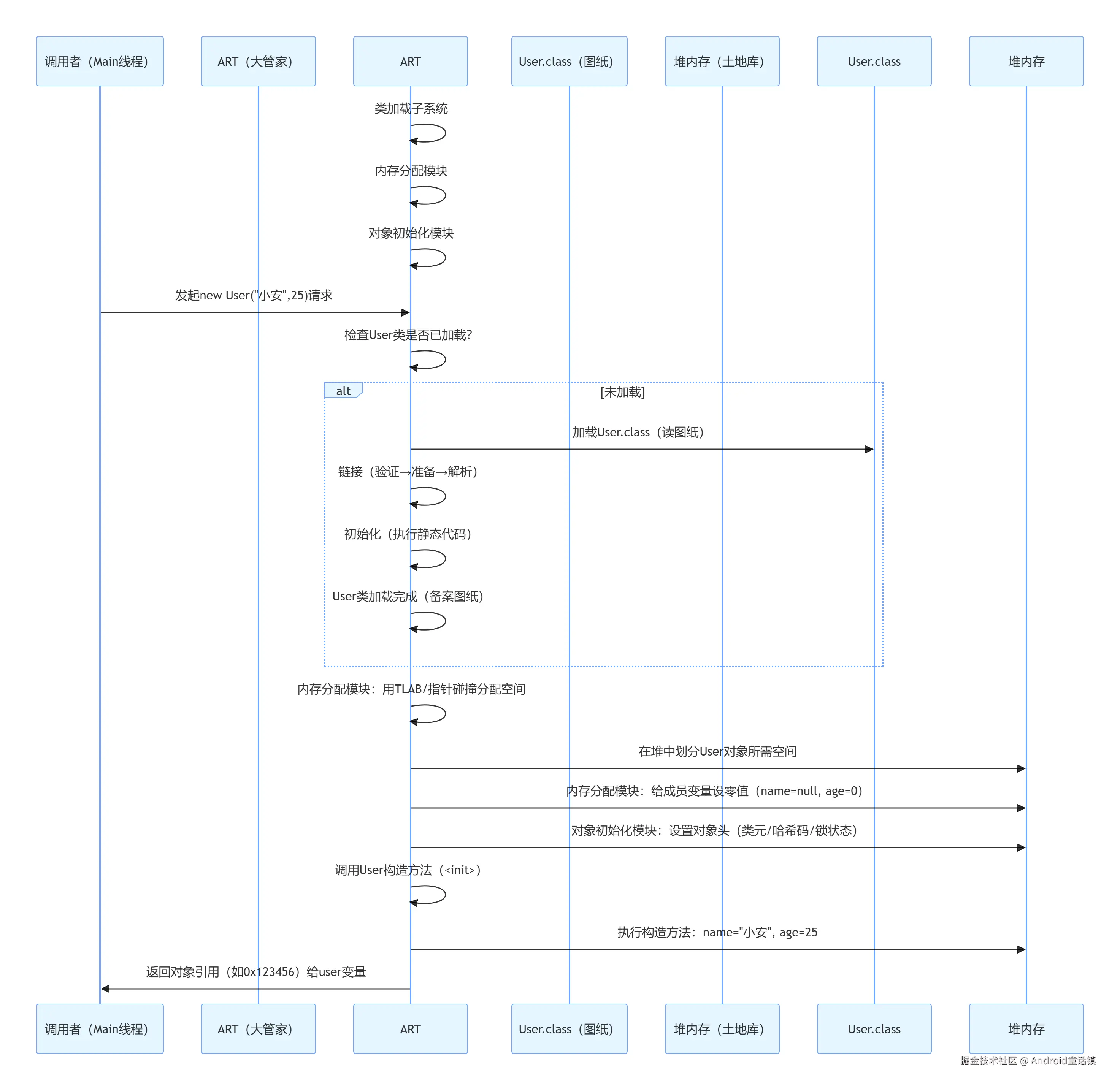 为了更直观,咱们用时序图把 "调用者→ART→堆内存" 的交互过程画出来(用 Mermaid 语法,你可以复制到支持 Mermaid 的工具里查看):