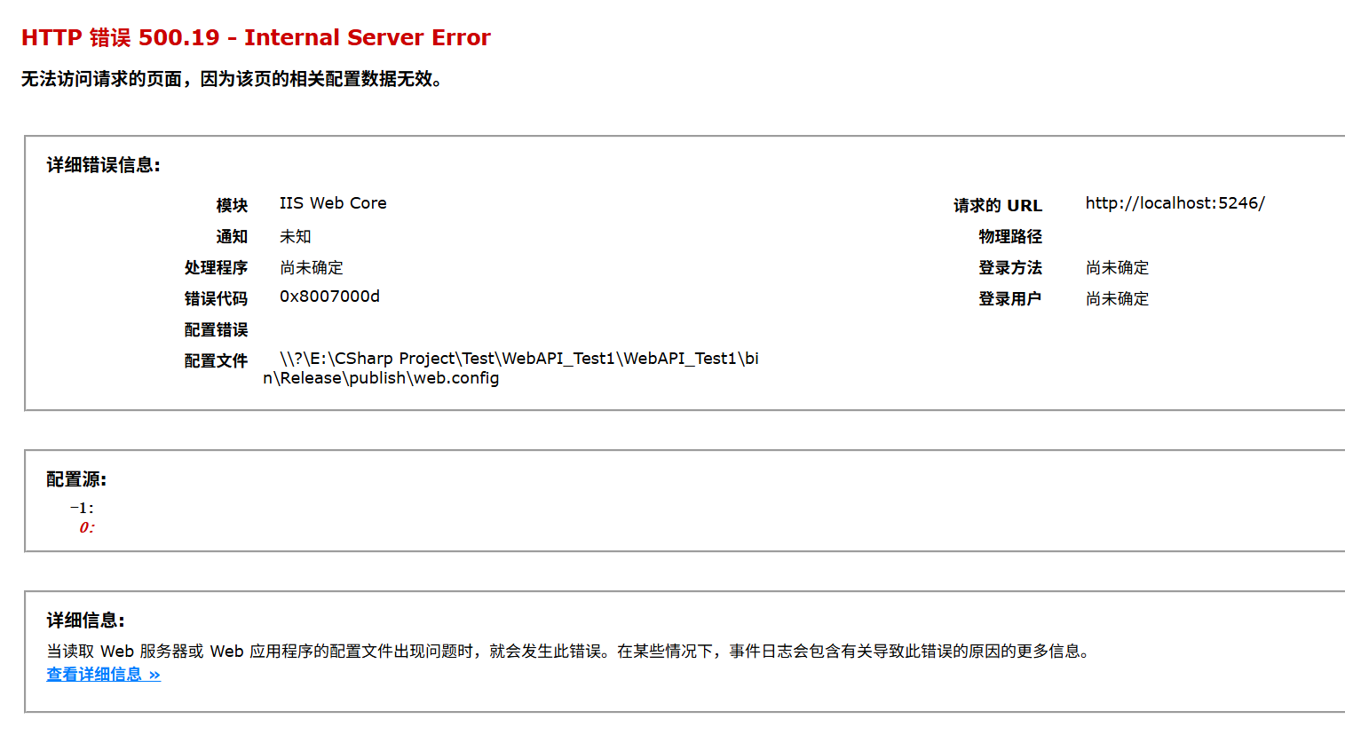 尝试将 web.config 文件中的 hostingModel 设置为 outofprocess,或删除该属性: