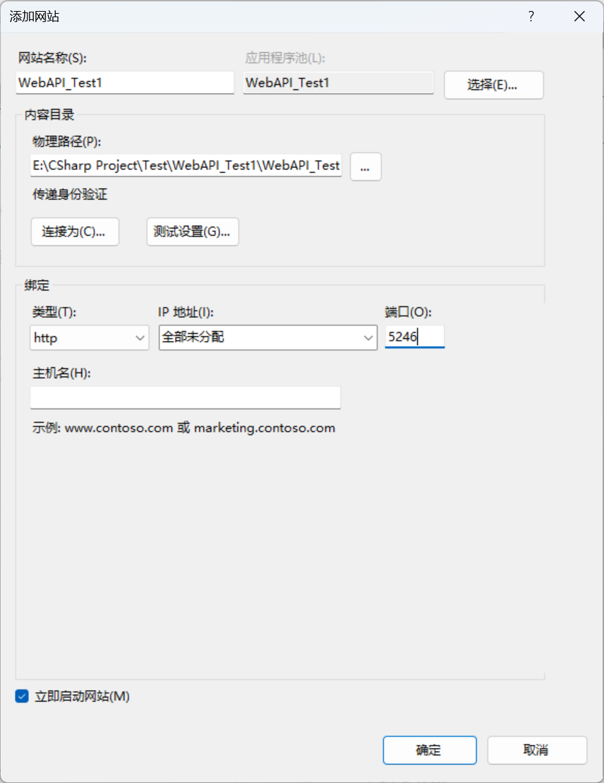 端口这里随意,只要不冲突就行,不必和 VS 中的配置文件 launchSettings.json 端口号一样