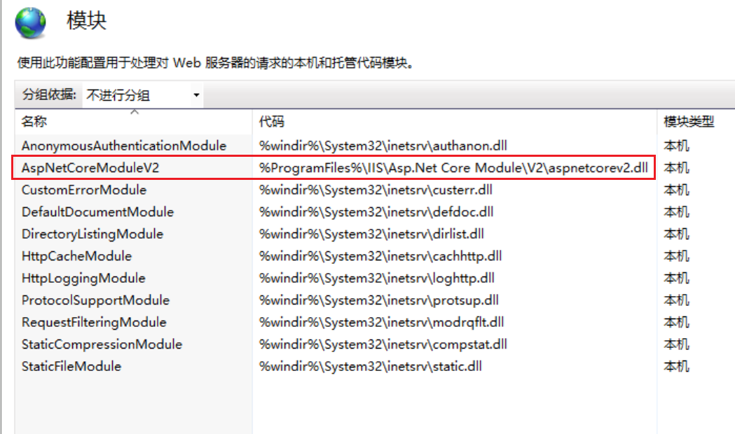 如果你看到 AspNetCoreModuleV2 这一项,说明 Hosting Bundle 安装成功了