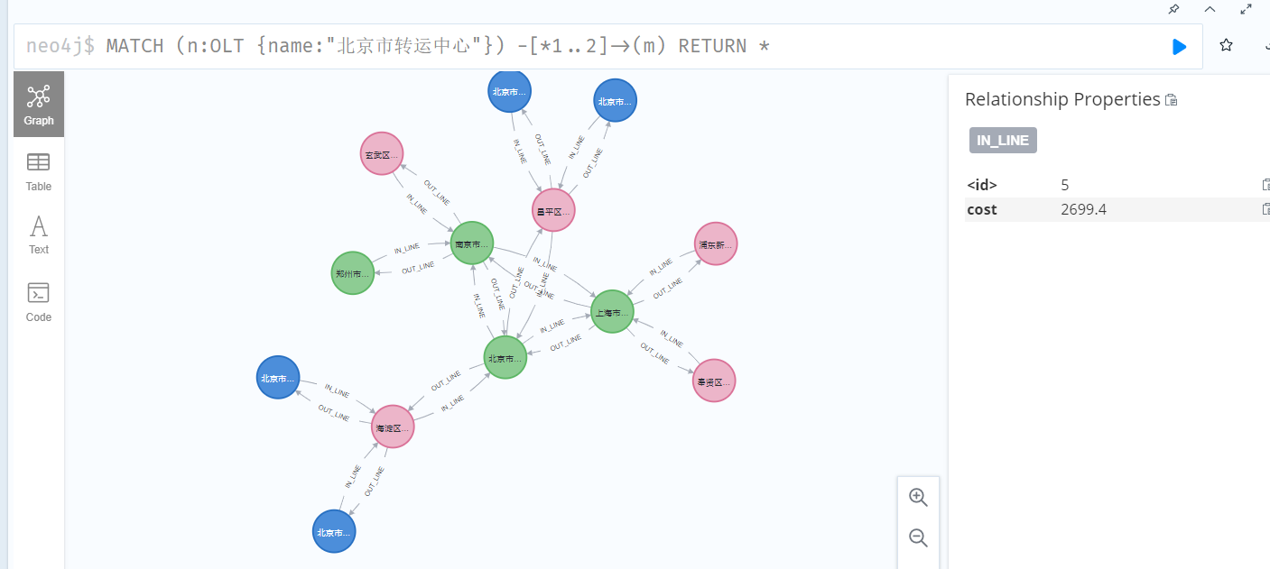 简单来说,以"北京市转运中心"为中心,查询的效果来看与之有一个或两个点长度对应的关系数据都将会返回