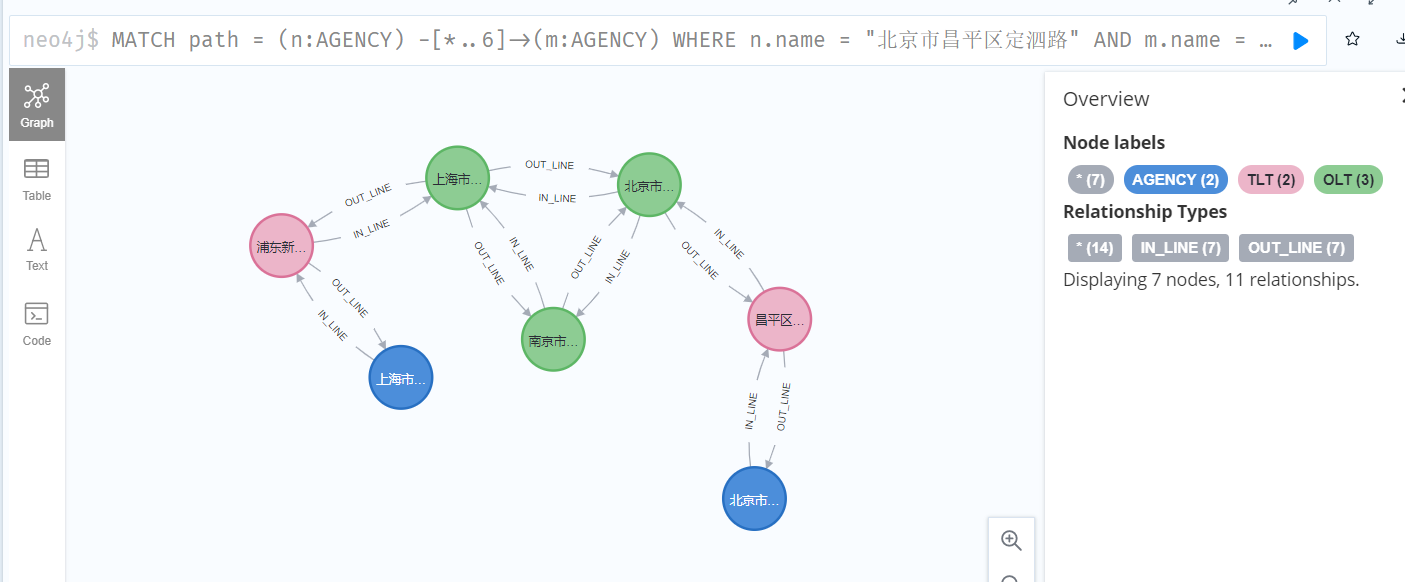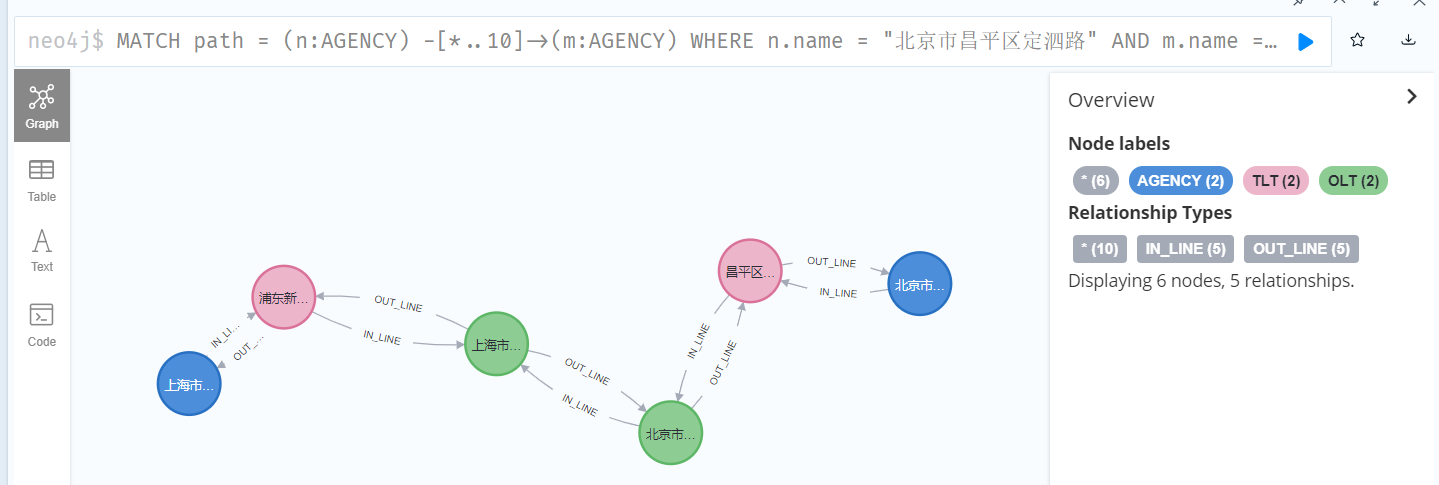查询两个网点之间所有的路线,最大深度为6,可以查询到2条路线,其中where即指定具体的筛选条件,就像mysql中指定具体的字段值等于某个数