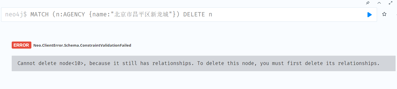 有关系的节点是不能直接删除的,如下,当删除 "北京市昌平区新龙城"这个节点时抛错