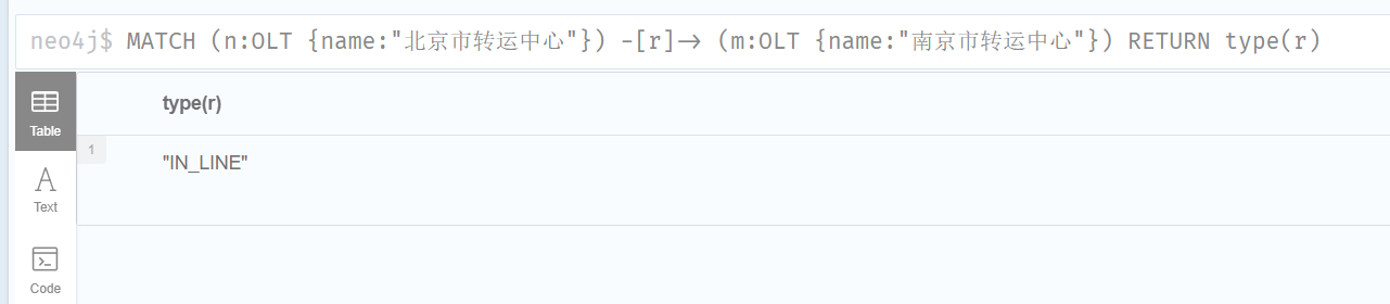 MATCH (n:OLT {name:"北京市转运中心"}) -[r]-> (m:OLT {name:"南京市转运中心"}) RETURN type(r)