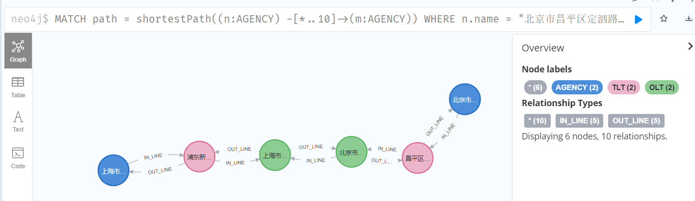 查询两个网点之间最短路径,查询深度最大为10,注意这里使用了函数:shortestPath