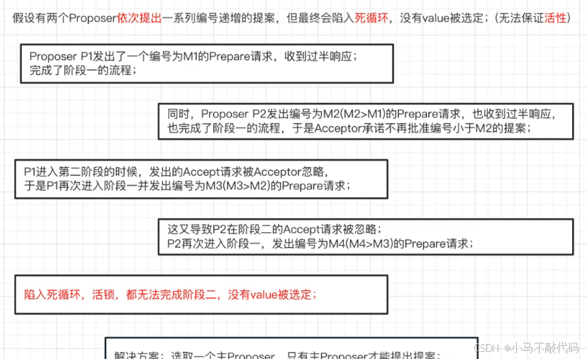 整个Paxos算法就是想说明:每个Proposer生成的提案都去争取大多数Acceptor的批准。一旦有某个Proposer生成的提案[M0, V0]被大多数批准了,即便后面发现还有更多其他Proposer生成的提案[Mn, Vn]也被大多数Acceptor批准,那么这些提案的value值其实都是一样的,都为V0。因此就可以让每个Proposer都统一为一个value值为V0的提案,从而保证一致性。