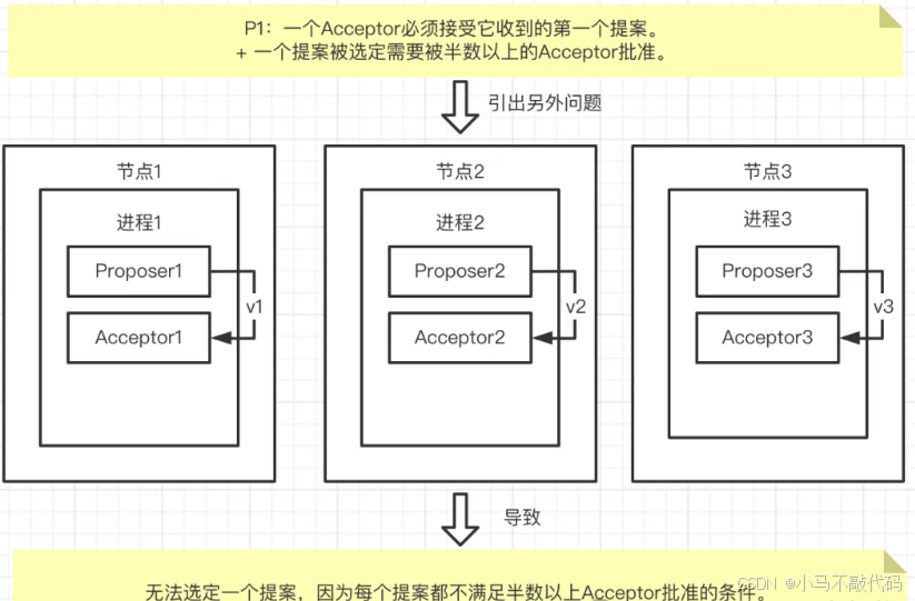 注意:这里强调"一个提议被多数Acceptor接受",而不是"一个值被多数Acceptor接受"。