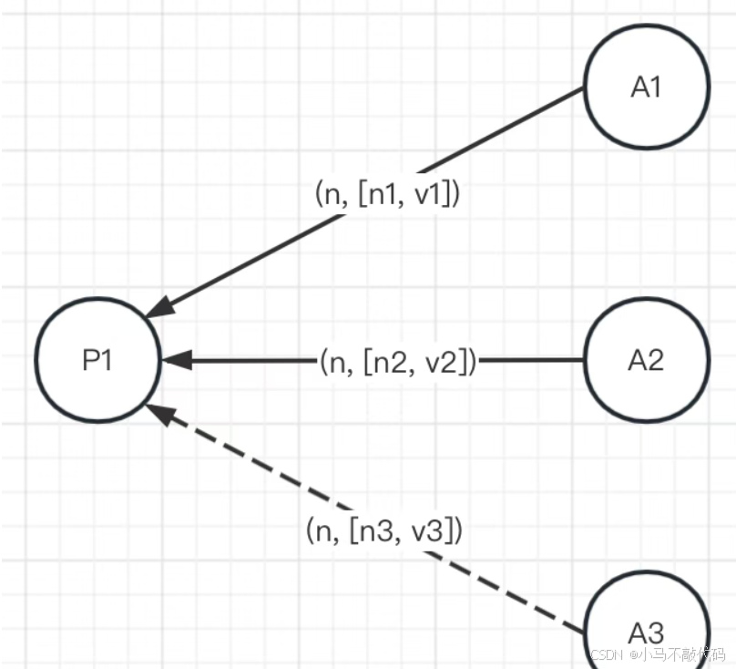 如下图示:Proposer广播Prepare请求之后,收到了A1和A2的应答,应答中携带了它们之前接受过的[n1, v1]和[n2, v2]。Proposer则根据n1、n2的大小关系,选择较大的那个提议对应的值。比如n1 > n2,那么就选择v1作为提议值,最后向Acceptor广播提议[n, v1]。