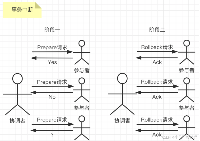 四.协调者收到所有参与者反馈(Ack)后中断事务。协调者接收到所有参与者反馈的Ack消息后,完成事务中断。
