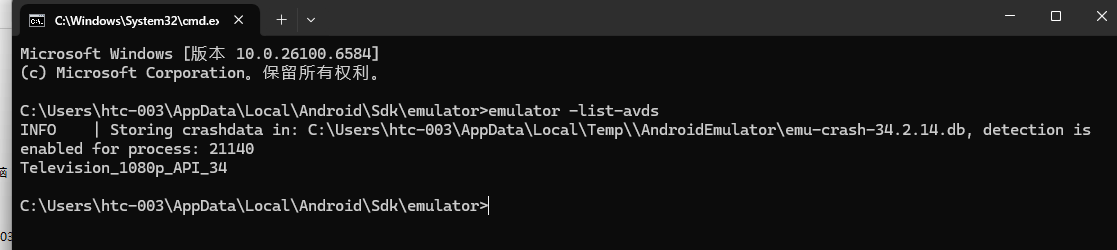 2、emulator -avd Television_1080p_API_34 -verbose 启动特定虚拟机