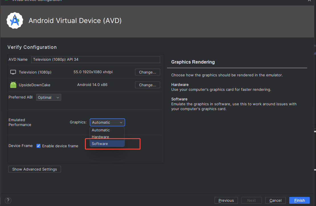 有些虚拟机添加的时候Graphics根本不能选,只有默认的Automatic,这个时候就只能去改配置文件了,找到自己的avd目录对应的虚拟机,找到config.ini文件,我的如下:D:.android\avd\Pixel_8_Pro_API_34.avd\config.ini