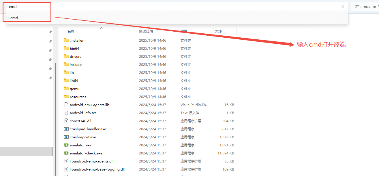 找到emulator的目录,按如下操作打开命令行: