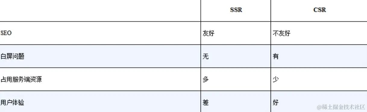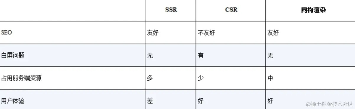 下图对比了 SSR、CSR 和同构渲染的优劣: