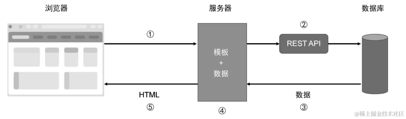 - 服务器将 HTML 字符串发送给浏览器,浏览器解析 HTML 内容并渲染。