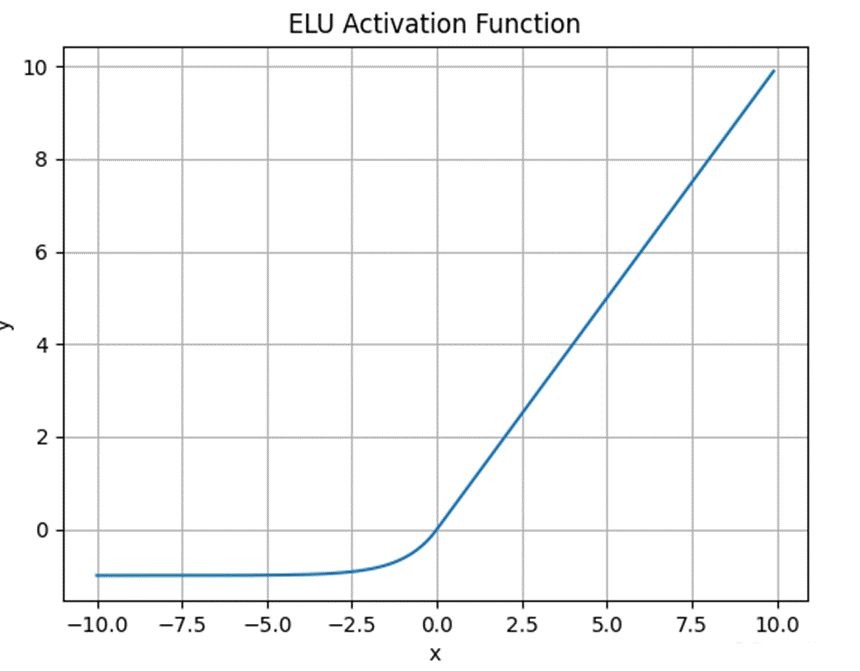 ELU(Exponential Linear Unit,指数线性单元)是一种更复杂的 ReLU 变体,由 Djork 等人提出。其数学表达式为: