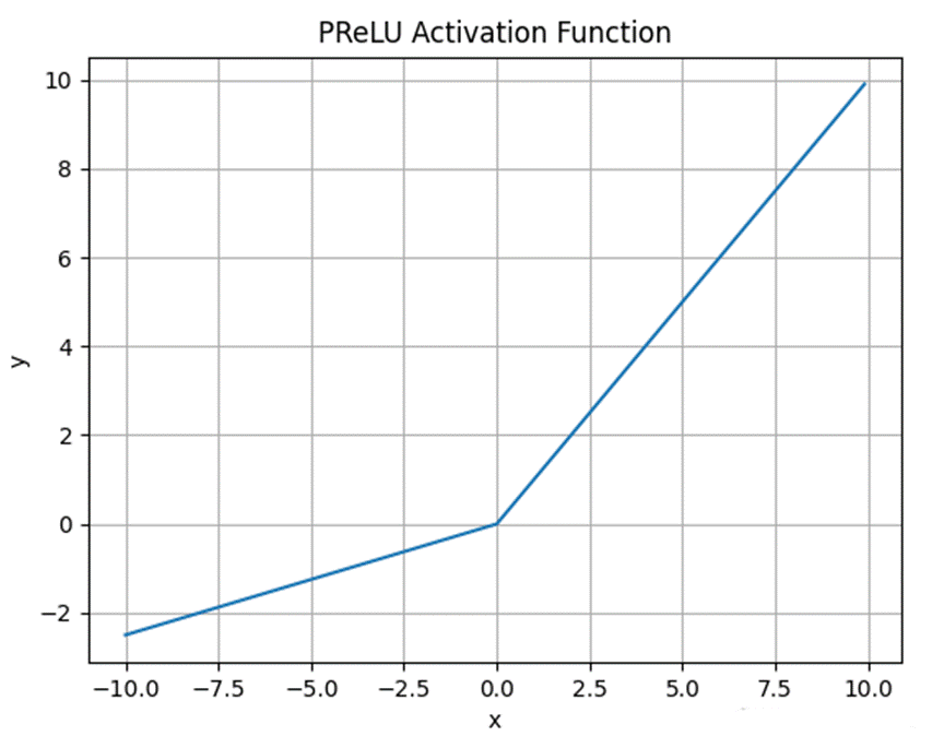 PReLU(Parametric ReLU,参数化 ReLU)是 Leaky ReLU 的进一步改进,它将 α 作为可学习的参数,在训练过程中与网络其他参数一起更新