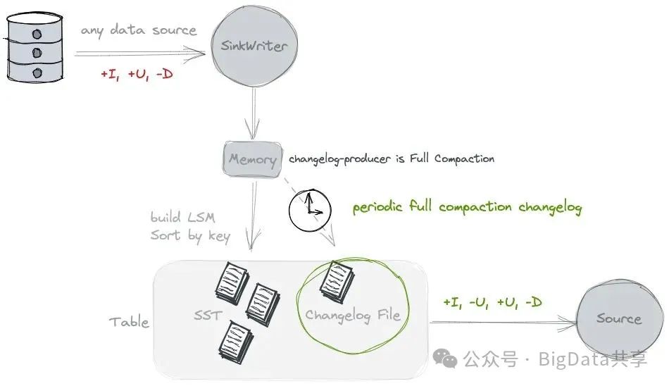 **功能:**设置 'changelog-producer' = 'full-compaction',Paimon 通过全量压缩(full compaction)比较前后数据,生成变更日志;可通过 full-compaction.delta-commits 属性设置触发全量压缩的频率(默认值为 1,即每次 checkpoint 触发一次全量压缩)。