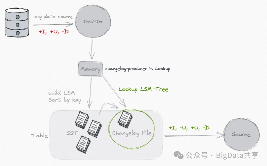 **功能:**设置 'changelog-producer' = 'lookup',Paimon 在提交数据写入前通过查找(lookup)生成变更日志。
