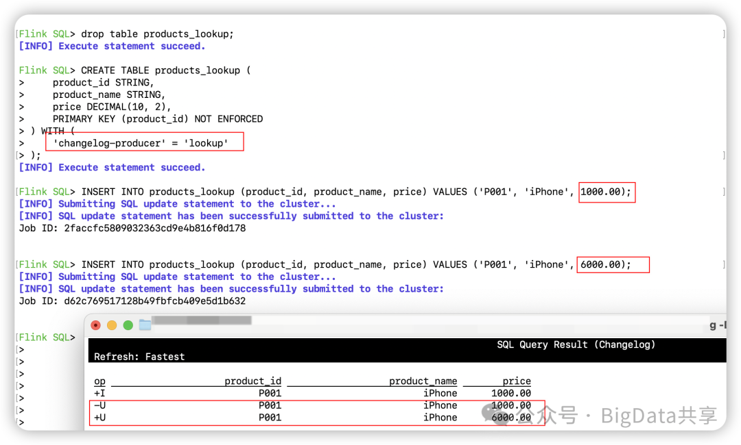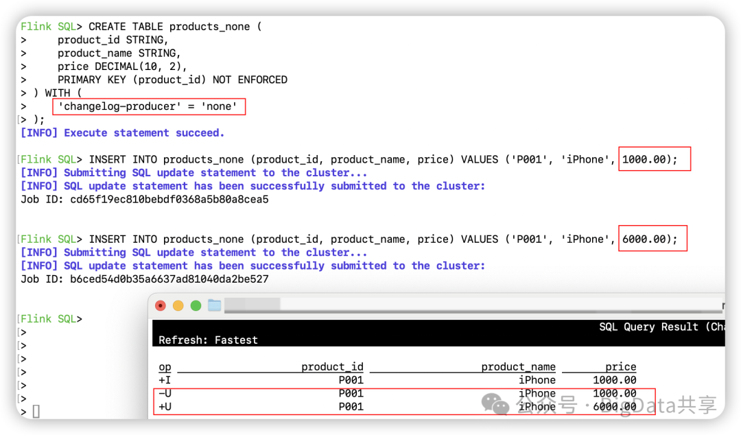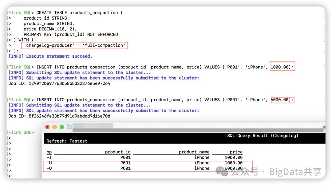CREATE TABLE products_compaction ( product_id STRING, product_name STRING, price DECIMAL(10, 2), PRIMARY KEY (product_id) NOT ENFORCED) WITH ( 'changelog-producer' = 'full-compaction');INSERT INTO products_compaction (product_id, product_name, price) VALUES ('P001', 'iPhone', 1000.00);INSERT INTO products_compaction (product_id, product_name, price) VALUES ('P001', 'iPhone', 6000.00);