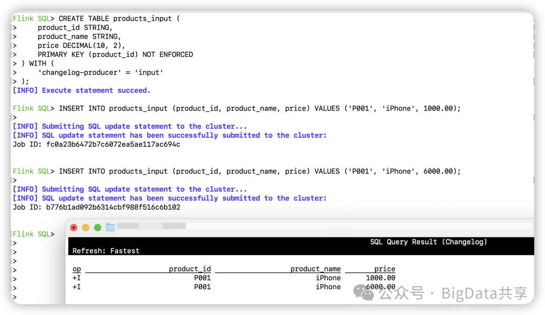 CREATE TABLE products_input ( product_id STRING, product_name STRING, price DECIMAL(10, 2), PRIMARY KEY (product_id) NOT ENFORCED) WITH ( 'changelog-producer' = 'input');