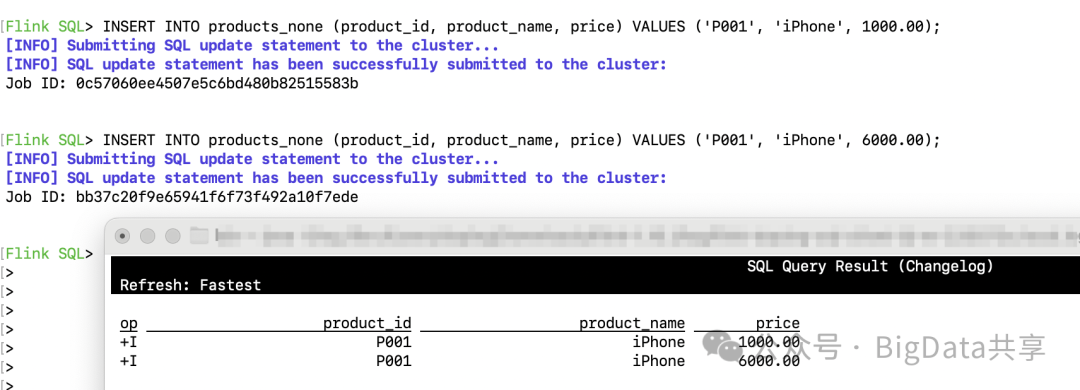 另起一个客户端进行流读,插入2条数据,可以看到changelog数据就是写入的原始数据;