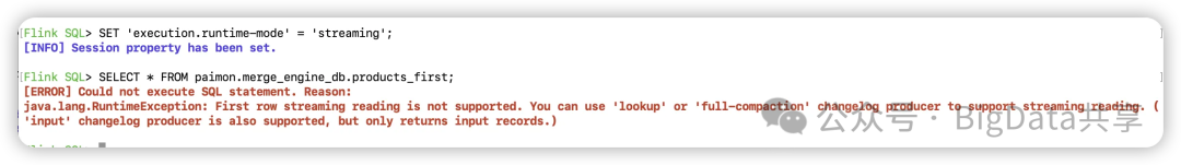 在上一篇《主键表之合并引擎merge-engine》中的结尾,当 'merge-engine' = 'first-row',开启流读的时候,会抛一下错误,提示要使用 lookup 或 full-campaction 这两种 changelog producer 才支持流读,input 模式也支持,但是只会返回输入的记录。