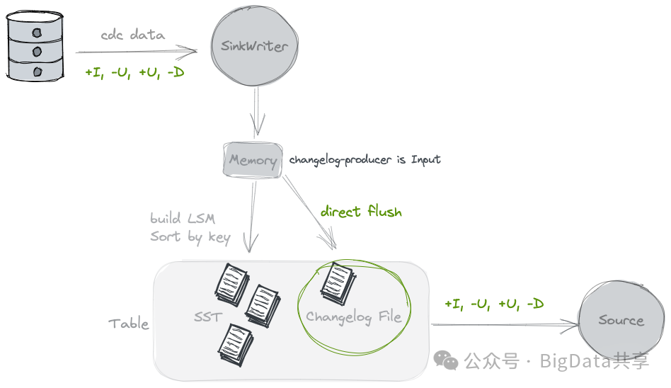 功能:设置 'changelog-producer' = 'input',Paimon 将输入数据直接作为完整的变更日志,保存到独立的 changelog 文件中。