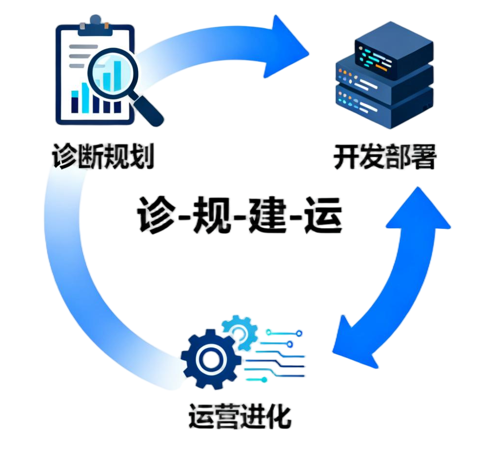 **"诊断规划找方向、开发部署抓落地、运营进化促生长"**的三阶段路径,本质是用"诊---规---建---运"闭环,解决"建什么、怎么建、如何用"的核心问题。