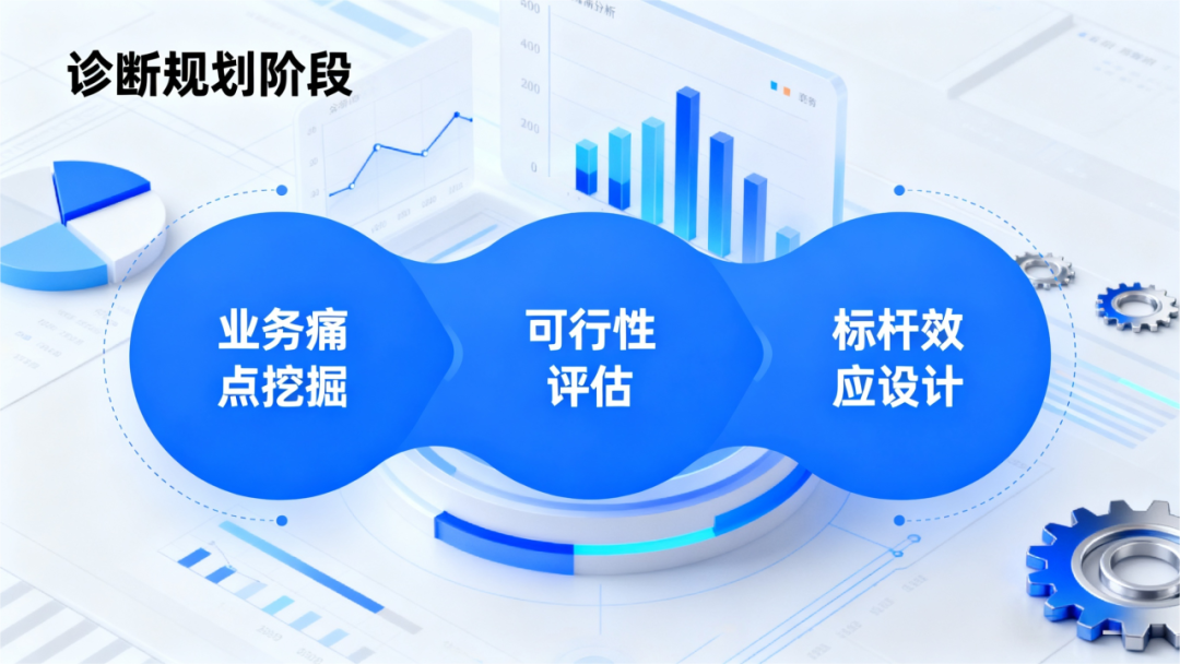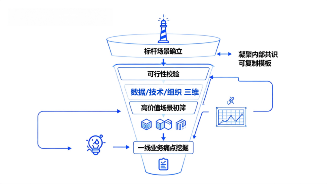 打破传统"自上而下"的宏观规划误区,从一线业务痛点中挖掘突破口,筛选出兼具高业务价值与高可行性的示范场景,为后续推广树立可复制的标杆,同时凝聚内部共识。