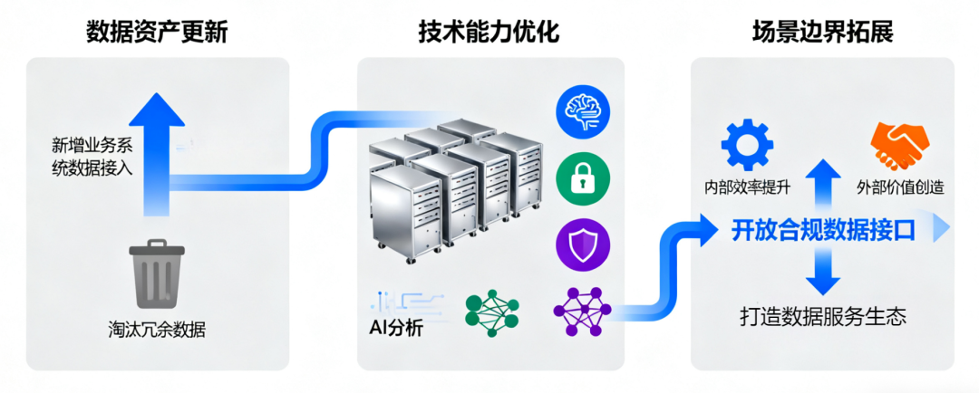 **定期更新数据资产:**新增业务系统数据接入、淘汰冗余数据,保障数据"鲜活度";